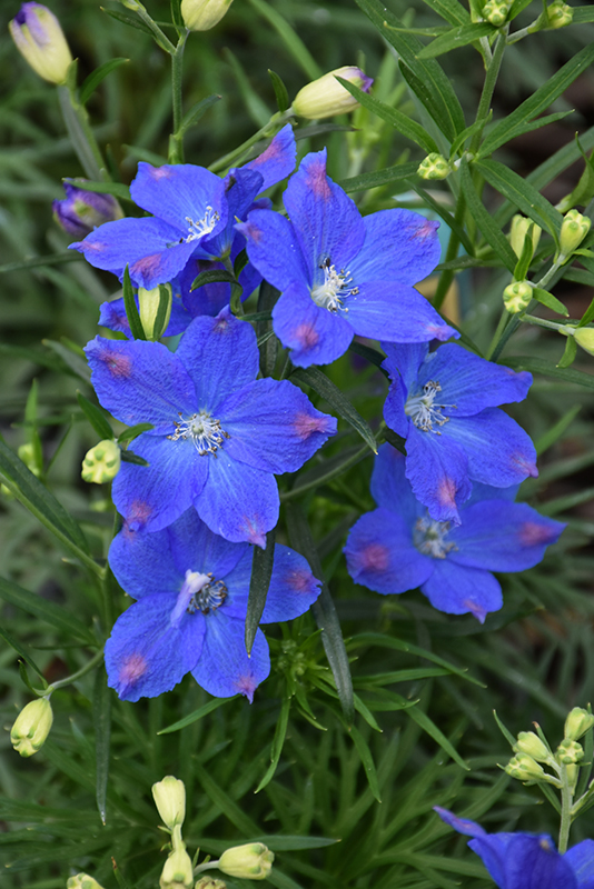 Blue Mirror Delphinium has masses of beautiful panicles of blue flowers with violet overtones at the ends of the stems from early summer to early fall, which are most effective when planted in groupings. The flowers are excellent for cutting. Its crinkled ferny compound leaves remain dark green in colour throughout the season.