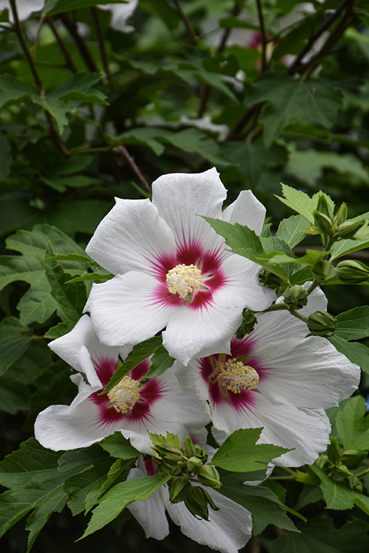 Lohengrin Rose of Sharon features bold lavender trumpet-shaped flowers with dark red throats along the branches from mid summer to mid fall. It has forest green deciduous foliage. The lobed leaves do not develop any appreciable fall colour.