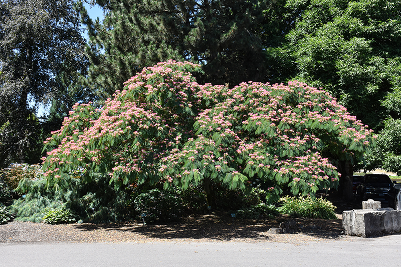 Attractive airy foliage and open umbrella-like form make this a highly desired tree, casts light shade, leaves tend to close for the night; interesting and graceful pink fuzzy flowers are fragrant and will scent the air
