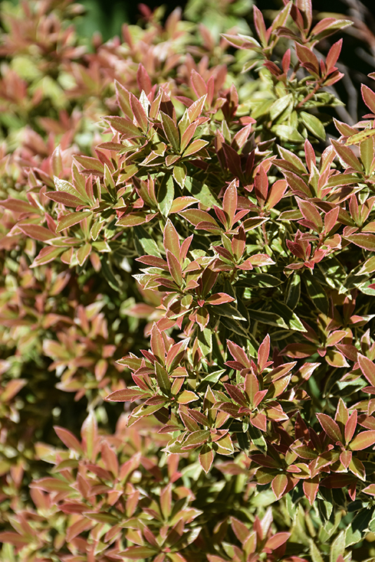 A smaller variety with showy chains of small white bell-shaped flowers and bright scarlet emerging foliage that matures to dark green with white edges; performs best in moist, organic and acidic soils