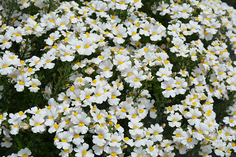 Sunsatia Coconut Nemesia will grow to be about 10 inches tall at maturity, with a spread of 18 inches. When grown in masses or used as a bedding plant, individual plants should be spaced approximately 12 inches apart. Its foliage tends to remain low and dense right to the ground. This fast-growing annual will normally live for one full growing season, needing replacement the following year.
