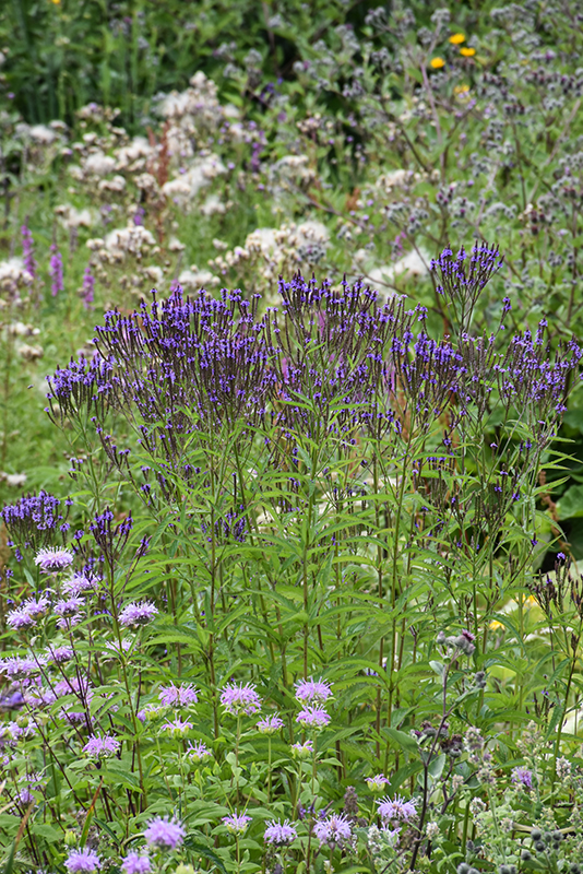 Blue Verbena will grow to be about 3 feet tall at maturity extending to 4 feet tall with the flowers, with a spread of 3 feet. When grown in masses or used as a bedding plant, individual plants should be spaced approximately 28 inches apart. Its foliage tends to remain dense right to the ground, not requiring facer plants in front. It grows at a fast rate, and under ideal conditions can be expected to live for approximately 5 years. As an herbaceous perennial, this plant will usually die back to the crown each winter, and will regrow from the base each spring. Be careful not to disturb the crown in late winter when it may not be readily seen!