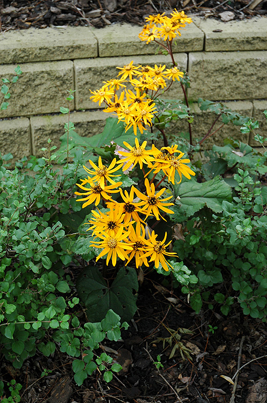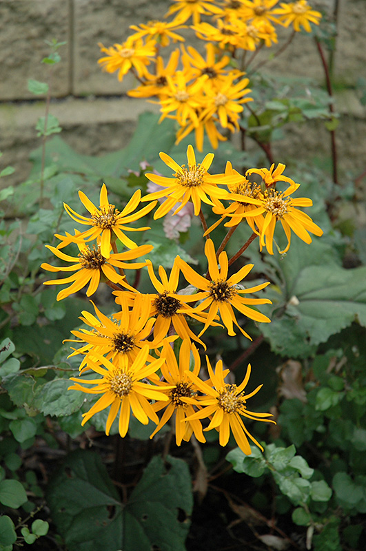 Desdemona Rayflower features bold panicles of gold daisy flowers at the ends of the stems from late summer to early fall. Its attractive large serrated round leaves emerge deep purple in spring, turning dark green in colour with curious purple undersides and tinges of deep purple throughout the season.