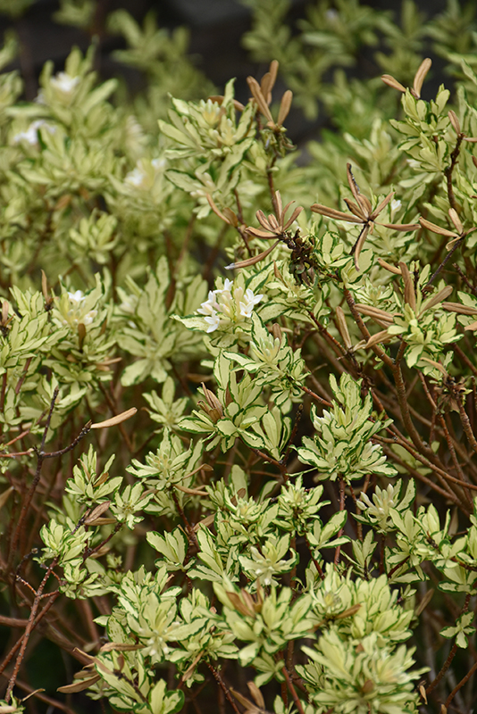 Briggs Moonlight Daphne features showy clusters of fragrant white tubular flowers at the ends of the branches in mid spring, which emerge from distinctive pink flower buds. It has attractive green-variegated creamy white foliage which emerges buttery yellow in spring. The narrow leaves are highly ornamental and remain creamy white throughout the winter.