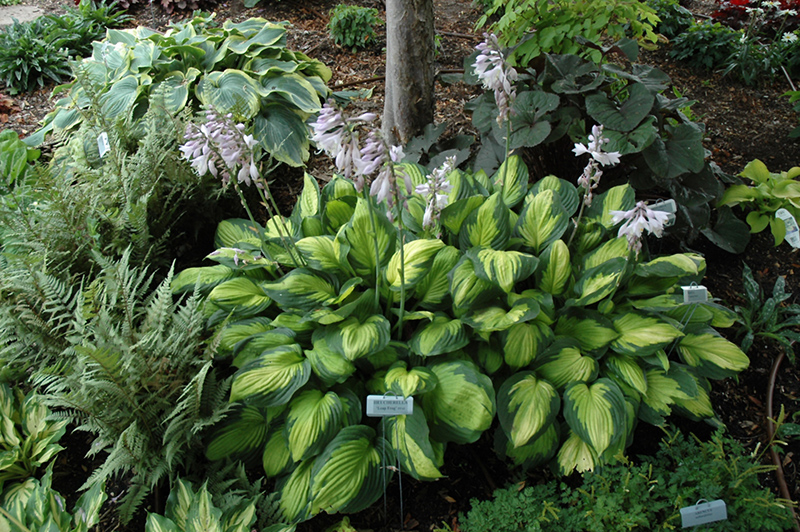 A medium sized variety great for shaded beds, borders and containers; features mounds of heart-shaped foliage with heavy texturing emerging chartreuse and turning to gold with wide green margins; pale lavender flowers appear in mid summer
