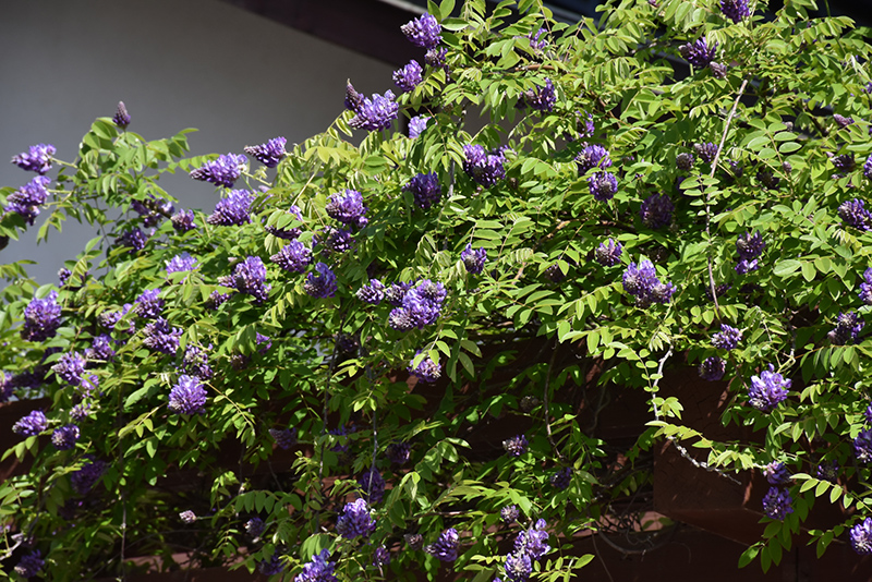 Blue Moon Wisteria will grow to be about 30 feet tall at maturity, with a spread of 24 inches. As a climbing vine, it tends to be leggy near the base and should be underplanted with low-growing facer plants. It should be planted near a fence, trellis or other landscape structure where it can be trained to grow upwards on it, or allowed to trail off a retaining wall or slope. It grows at a fast rate, and under ideal conditions can be expected to live for approximately 30 years.