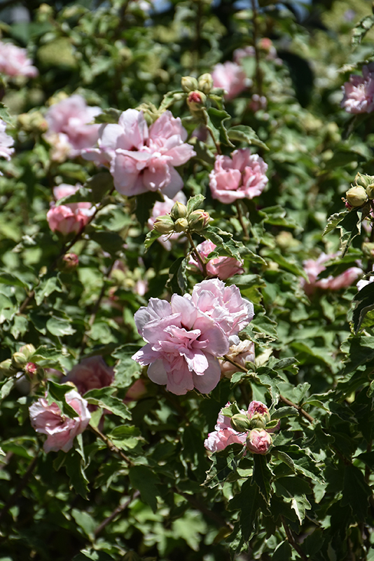 Sugar Tip® Rose of Sharon features bold double pink round flowers along the branches from mid summer to early fall. It has attractive creamy white-variegated bluish-green foliage. The lobed leaves are highly ornamental but do not develop any appreciable fall colour.