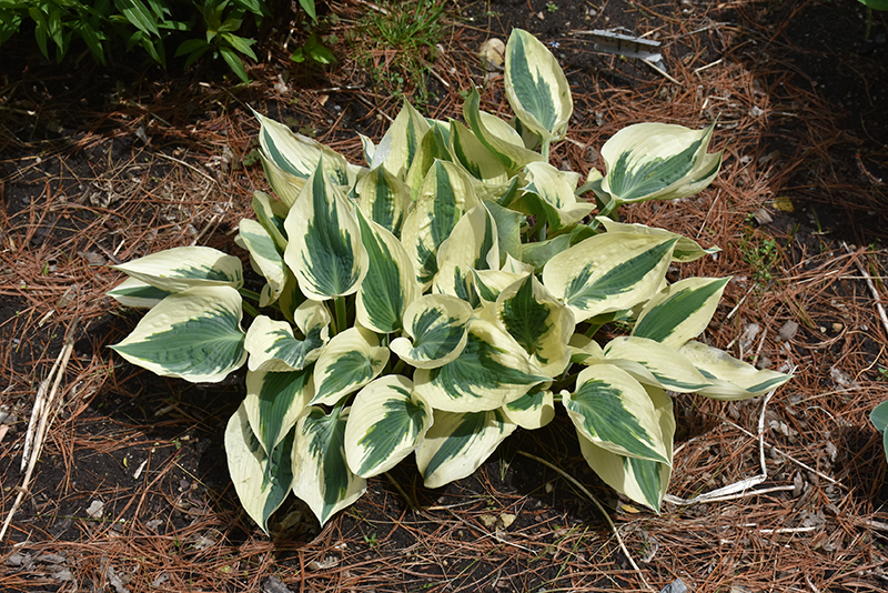 A show, medium sized variety featuring dense mounds of blue-0green leaves with wide, creamy white margins; lavender flowers appear in mid-summer; adds texture, contrast and color to shaded beds, borders and containers; easy to grow and low maintenance