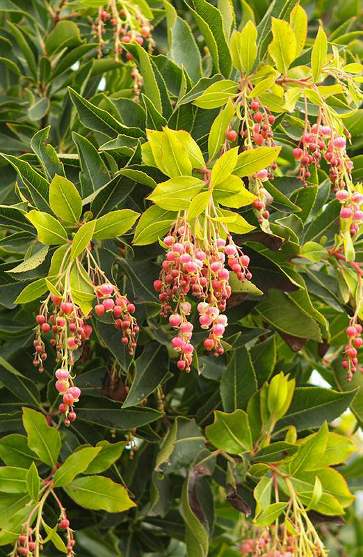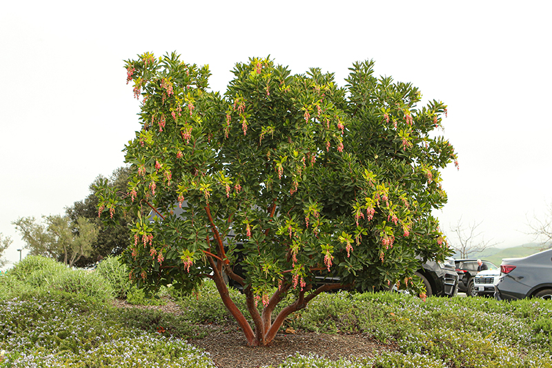 Marina Strawberry Tree features showy clusters of shell pink bell-shaped flowers hanging below the branches from mid fall to late winter. It has green evergreen foliage which emerges light green in spring. The pointy leaves remain green throughout the winter. The peeling antique red bark is extremely showy and adds significant winter interest.
