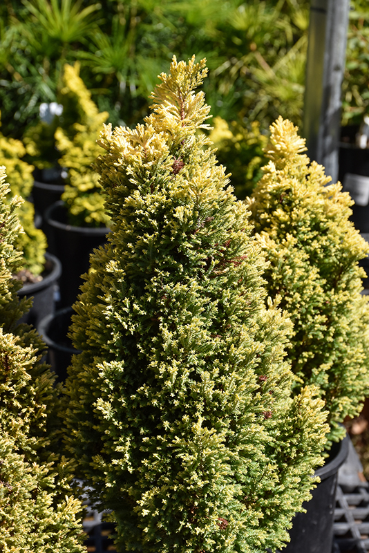 Treasure Island Falsecypress is a dwarf conifer which is primarily valued in the landscape or garden for its distinctively pyramidal habit of growth. It has gold evergreen foliage which emerges yellow in spring. The scale-like sprays of foliage remain gold throughout the winter. The shaggy antique red bark adds an interesting dimension to the landscape.