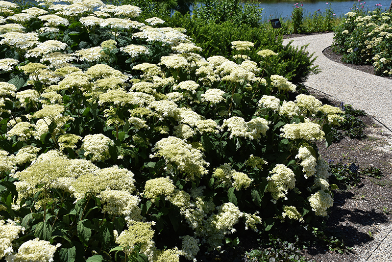 A beautiful selection with flowers that first open as white lacecaps, then the outer florets double creating a starburst effect; best if treated like a perennial and pruned to a few inches from the ground in spring, blooms on new growth