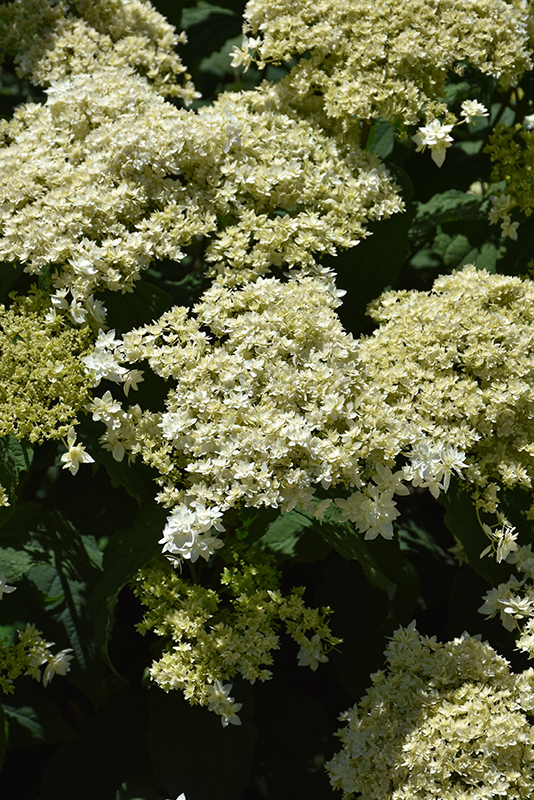 Hayes Starburst Hydrangea features bold clusters of double white flowers with creamy white overtones at the ends of the branches from early to late summer. The flowers are excellent for cutting. It has forest green deciduous foliage. The heart-shaped leaves do not develop any appreciable fall colour.